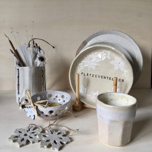 Sämtliches Material (wie Ton, Werkzeuge, Schablonen und Vorlagen, Stempel, Ausstecher etc.), Getränke sowie unsere Candybar.